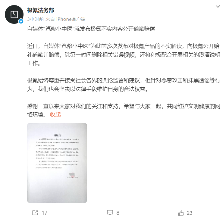 4月21日,极氪法务部发文称,自媒体“汽修小中医”就发布极氪不实内容公开道歉赔偿。
