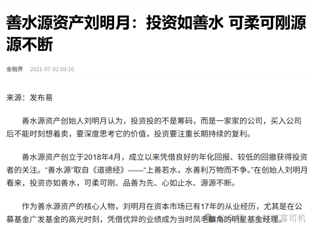 善水源资产是由“公转私”的明星基金经理刘明月于2018年创立,之所以取名善水源是因为在刘明月看来,“投资亦如善水,可柔可刚、品善为先、心如止水、源源不断。”