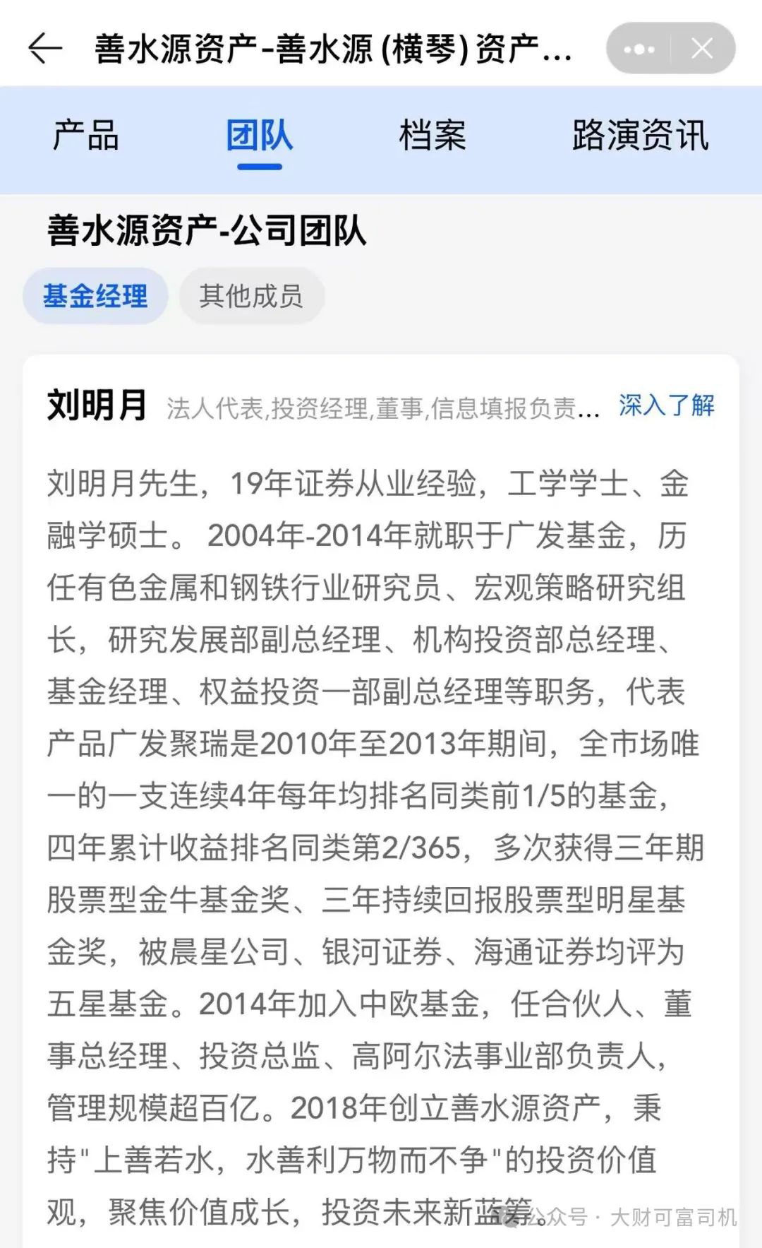 此后,刘明月加盟中欧基金,但在中欧基金表现不佳,管理的产品严重跑输同类平均业绩。2018年,他创立善水源资产,以“上善若水,水善利万物而不争”的投资价值,聚焦价值成长,投资未来新蓝筹。