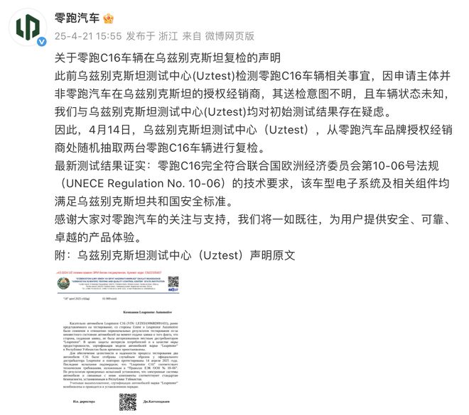 4月21日,@零跑汽车 发布关于零跑C16车辆在乌兹别克斯坦复检的声明: