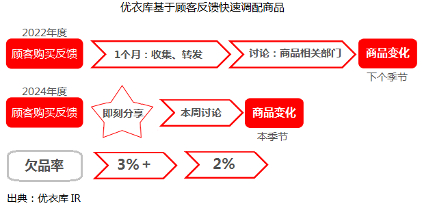 数字化管理在店面延伸的主要表现形式是减少人工作业,同步提高员工待遇,通过VMD及自助服务技术端口,建立标准化随机销售机制,导购员的工作大体限定在难度较高的收银、辅助咨询等方面,从而大大提高了部门之间、渠道之间、员工之间协作效率。与2022年8月比较,2024年8月优衣库的店铺人时销售额提高约30%。