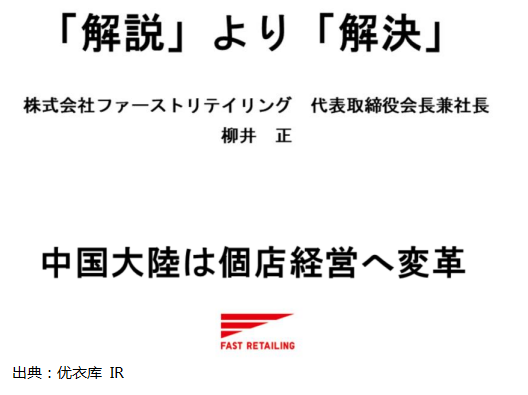柳井正在讲话中开头就提出中国大陆业务问题(参见下图),认为做事的姿态最重要。中国大陆的优衣库业务挑战的本质性原因在于,它没有成为真正意义上的顾客需要的、地域大众喜爱的店。在中国大陆工作的员工和经营者素质很高,利用连锁店的优势,此前业务得以扩展。但目前的现状是,接受总部指示,所有店铺统一行动的倾向很突出,无法准确响应各地域顾客个性化需求特点,打造商品组合和销售卖场。