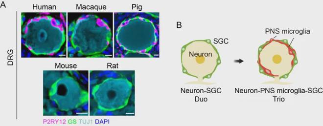 中国科学院深圳先进技术研究院研究团队扫描了人、猴子、猪的外周神经节,揪出一群“卧底细胞”——转录组、表观组、发育起源全和中枢小胶质细胞一模一样!且这群“外周小胶质细胞”直接抱住神经元胞体,像给手机贴膜一样紧密。没它们,神经元长不大、轴突伸不远,连感知功能都拉胯!