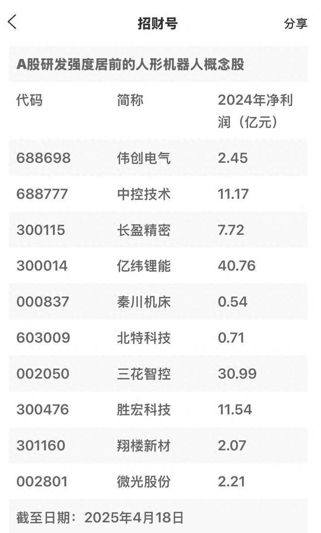据统计,A股市场人形机器人概念股超过百只。研发强度居前的有伟创电气(688698)、中控技术(688777)、长盈精密(300115)等。受此消息影响,今天上午,相关概念股盘中均有拉升行情,其中京城股份涨停。