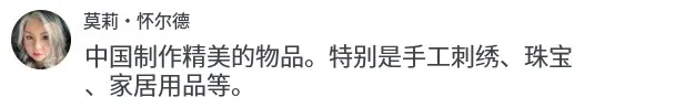 也有人说:中国制造的物品非常精美,尤其是手工刺绣、珠宝、家居用品等等。