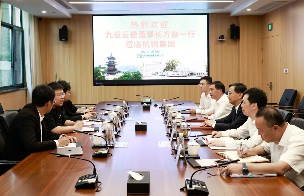 4月18日,杭钢集团党委书记、董事长章建成会见九章云极董事长方磊一行,双方就加强数字产业合作进行深入交流。杭钢集团党委副书记、总经理吴东明,党委委员、副总经理刘树林,双方相关单位(部门)负责人陪同并座谈。