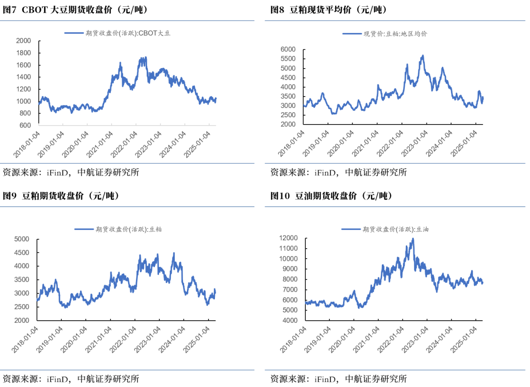 大豆:大豆现货平均价周环比跌0.22%,CBOT大豆期货价格周环比涨4.08%。
