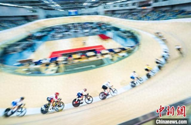 4月21日,为期三天的2025香港国际场地杯暨第十五届全运会场地自行车测试赛在位于将军澳的香港单车馆继续进行,众多选手在比赛中力争前茅,赛事运营方则测试相关竞赛组织工作,为今年11月举行的正式比赛做准备。图为参赛选手在精英全能赛(集体出发)的比赛中。中新网记者 侯宇 摄
