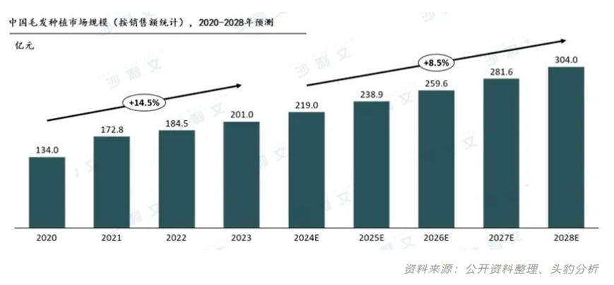 来源:雍禾医疗2024年年报与公司业绩形成鲜明对比的是行业的蓬勃发展。2020年到2023年,我国植发行业市场快速增长,主要得益于植发技术的进步和消费者对外貌重视的提高。同时,社交媒体和“颜值经济”推动了人们对外貌的关注,进一步促进了市场需求的增长。市场预计2024年到2028年,植发行业将继续保持快速发展,2028年市场规模将达304.0亿元,年均复合增长率(CAGR)为8.5%。在市场快速扩张的背景下,雍禾医疗如此缓慢的增长速度,不得不让人质疑公司的整体竞争实力。