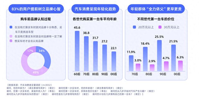 智能汽车时代,中国汽车消费市场购车人群的年龄持续下探,购车不再是中年家庭刚需,变成了年轻人的“数码大玩具”。白皮书的调研显示,实际拥有第一台车的平均年龄目前在30.5岁。其中,00后借助家庭资源,首台车购车年龄低至22岁,几乎大学毕业即拥有车。约四分之一的90、00后首次购车锁定20万元以上价格段,成为中高端汽车市场的潜在人群。