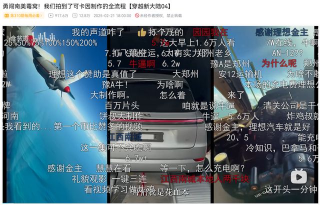 在真实体验的种草上,B站自驾、旅游等内容更充分结合户外旅行与汽车驾驶体验,在潜移默化中给到用户深度、直观的测评。理想汽车与UP主食贫道跨界合作,推出《穿越新大陆》系列内容,视频中,食贫道开着理想L9,从美国到乌斯怀亚横跨美洲大陆,历经城市、热带雨林,真实展现汽车性能。该系列视频全网播放量超3000万,仅深入南美毒窝单集,上线三天获得近千万播放,满屏的“感谢金主爸爸”、“金主加钱”, 充分体现了好内容和商业的有机融合。