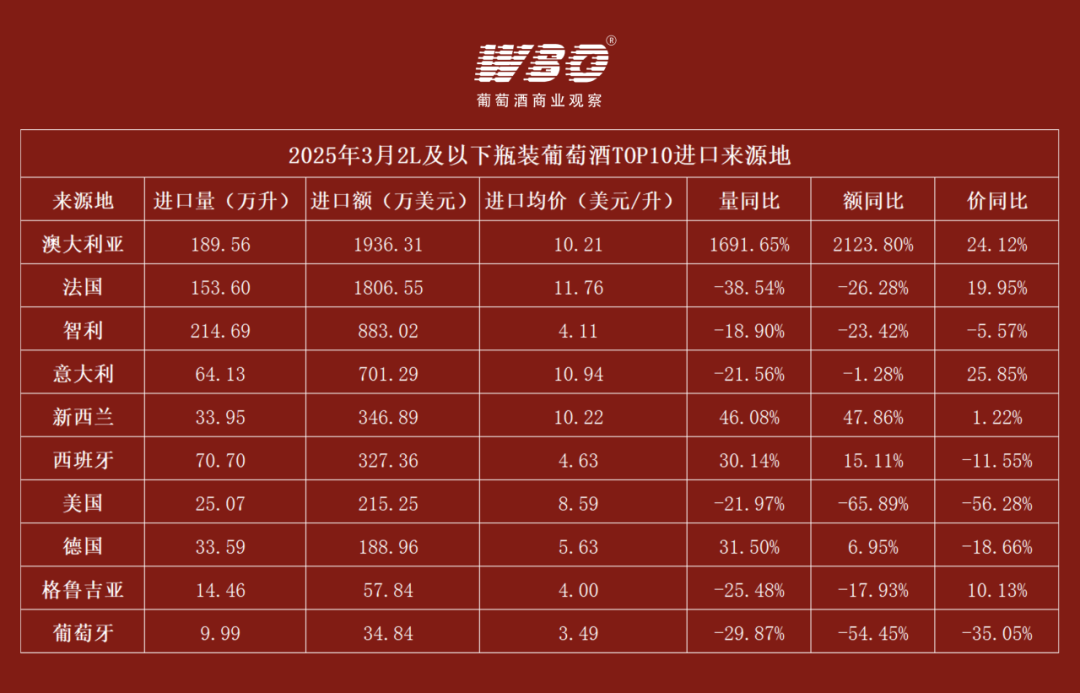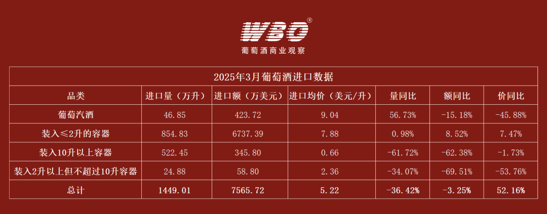 近日,海关总署公布了2025年3月中国葡萄酒进口数据:进口总量约为1449万升,同比下降36.42%;进口总额约为7566万美元(折合人民币约5.5亿元),同比小幅下滑3.25%。在整体回落的背景下,不同来源地的表现呈现出显著差异。更引人关注的是,在消费趋淡、出货承压的3月,进口葡萄酒的平均单价却同比上涨52.16%,这是结构升级,还是价格反弹?WBO将从多个维度带来详细解析。