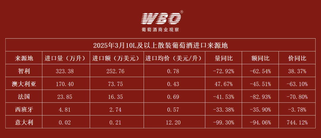 10L以上散酒:智利重回单月第一,澳大利亚开始清库存