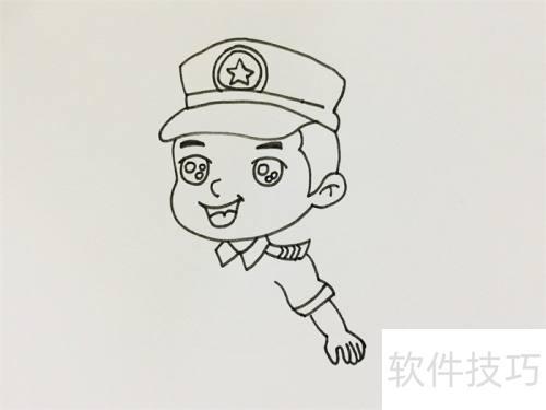 2、 先在脸上画出额头、眼睛、鼻子和嘴巴,再向下绘制衣领和一只手臂。
