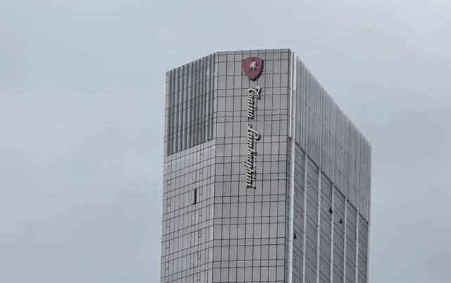 两栋大楼均为玻璃幕墙,外立面均已完工。其中公寓大楼上方的幕墙上竖立着硕大的兰博基尼“红底+黑白相间的金牛”标志,标志下方系“Tonino Lamborghini”字母。