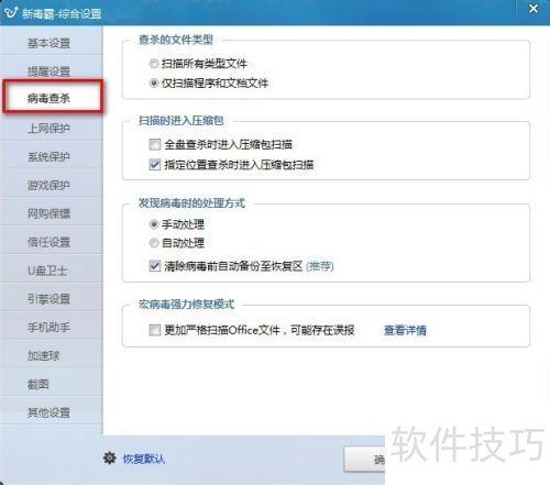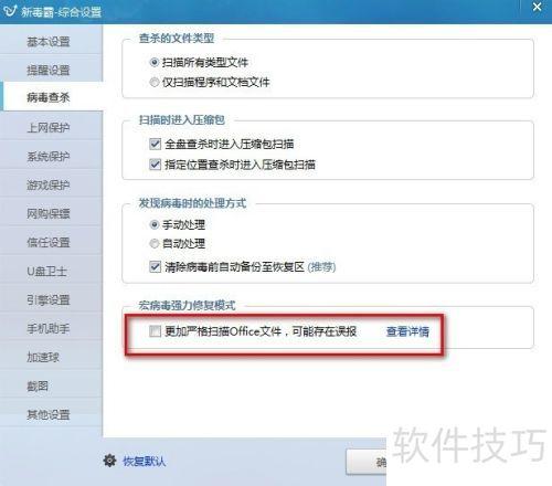14、 在宏病毒强力修复模式设置中,确认未勾选更加严格扫描Office文件,可能存在误报,以免提高误报几率。
