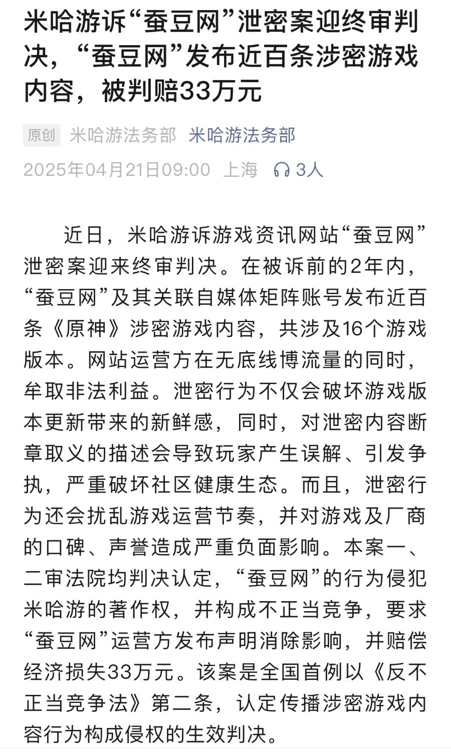 4月21日,米哈游法务部公众号发文称,在起诉蚕豆网前的2年内,该网站及其关联自媒体矩阵账号发布近百条《原神》涉密游戏内容,共涉及16个游戏版本。本案一、二审法院均判决认定,蚕豆网的行为侵犯米哈游的著作权,并构成不正当竞争。米哈游要求蚕豆网运营方发布声明消除影响,并赔偿经济损失33万元。
