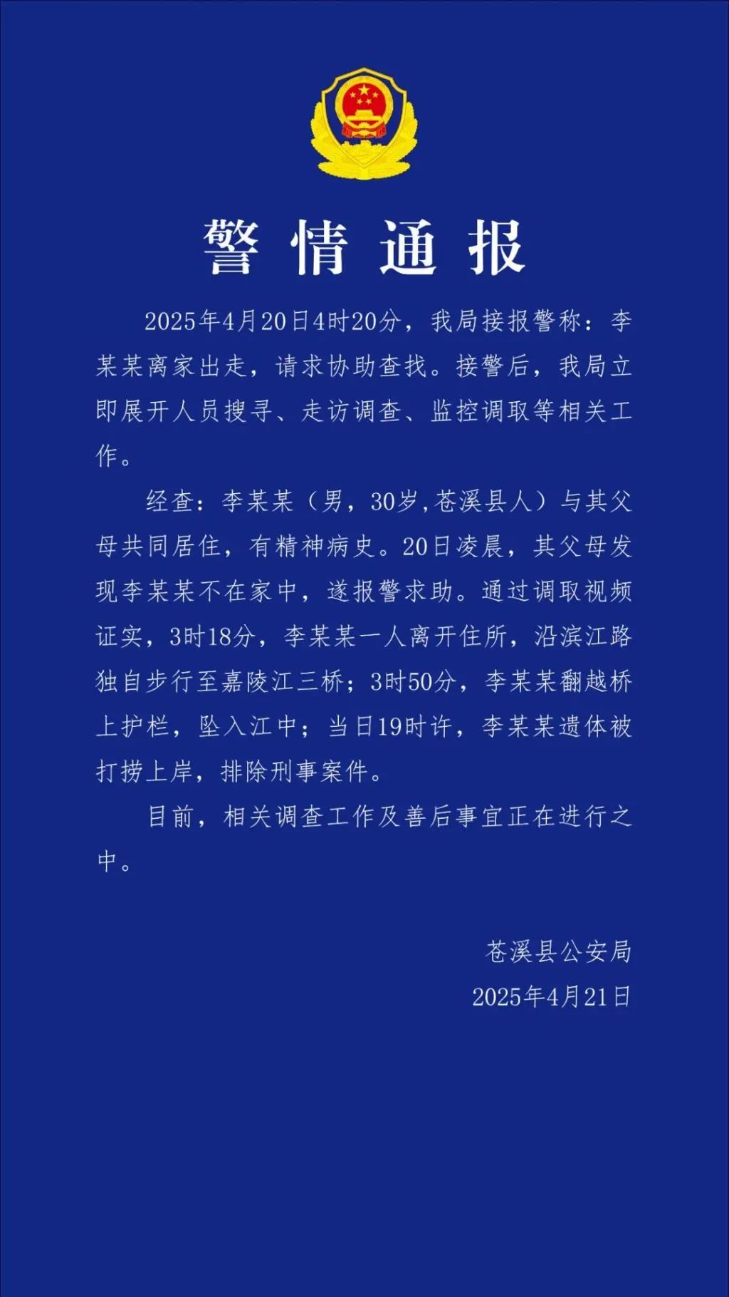 经查:李某某(男,30岁,苍溪县人)与其父母共同居住,有精神病史。20日凌晨,其父母发现李某某不在家中,遂报警求助。通过调取视频证实,3时18分,李某某一人离开住所,沿滨江路独自步行至嘉陵江三桥;3时50分,李某某翻越桥上护栏,坠入江中;当日19时许,李某某遗体被打捞上岸,排除刑事案件。