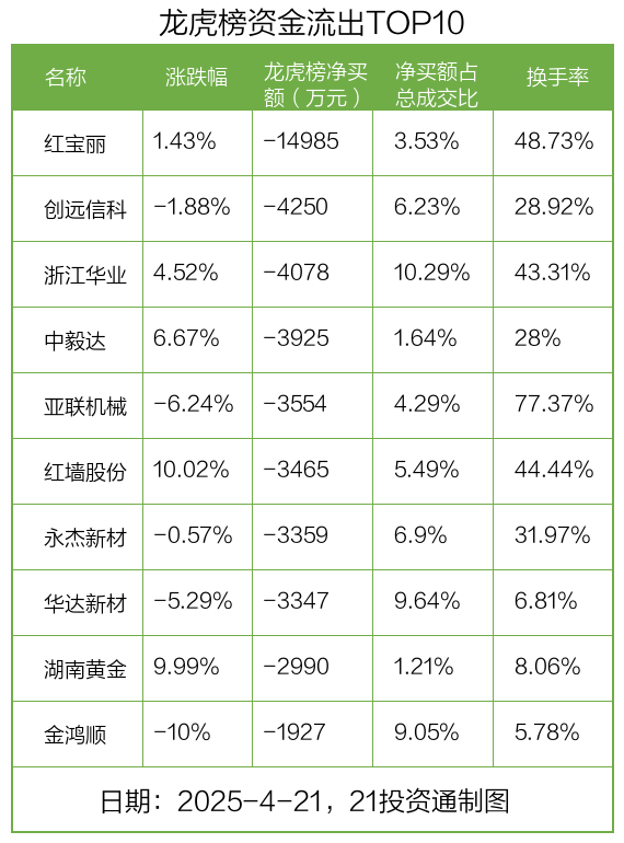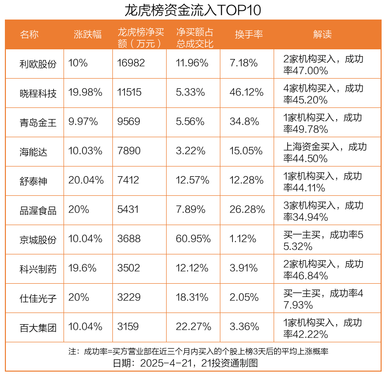 4月21日,上证指数上涨0.45%,深证成指上涨1.27%,创业板指上涨1.59%。盘后龙虎榜数据显示,共有48只个股因当日异动登上龙虎榜,资金净流入最多的是利欧股份(002131.SZ),达1.7亿元。