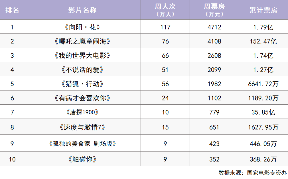 《向阳·花》上周收获票房4712万,该片已连续两周获得周票房榜冠军,目前累计票房1.79亿。