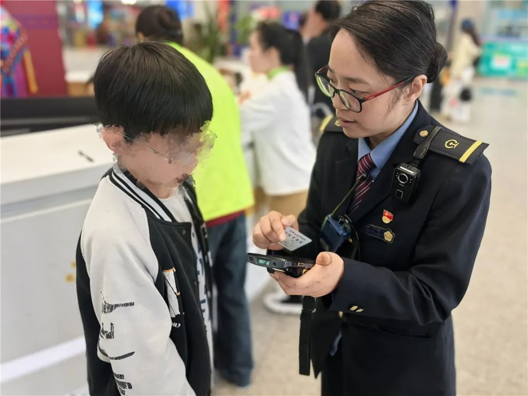 4月21日10时许,昆明站客运员张建斌在3A检票口发现一名男孩无家人陪伴,拉着行李箱在原地徘徊。他立即上前询问,并通知值班员洪艳瑞到现场处理。经询问得知,男孩与父母计划乘坐Z288次列车去宣威,在检票进站时不慎走散。