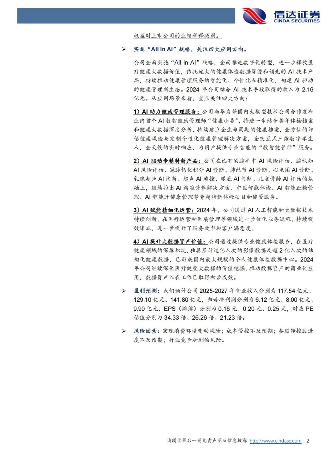 本文来自信达证券研发中心2025年4月21日发布的《美年健康(002044)点评报告:体检服务主业发展稳健,参转控加速推进,AI布局值得期待》,欲了解具体内容,请阅读报告原文,唐爱金S1500523080002,贺鑫S1500524120003