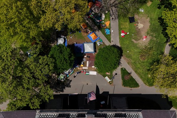 当地时间2024年5月13日,美国马萨诸塞州剑桥市,巴以冲突持续,亲巴勒斯坦示威者在哈佛大学校园内设立抗议营地。 IC photo