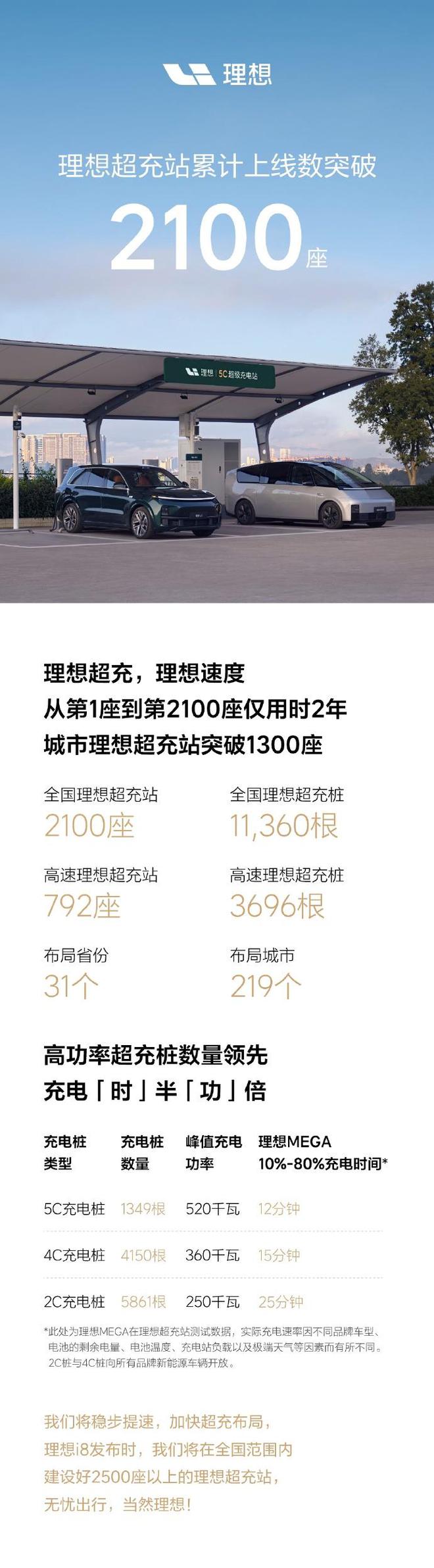 日前,理想汽车宣布理想超充站累计上线数突破2100座,从第1座到第2100座仅用时2年,其中理想超充站已经突破1300座,高速超充站已经突破792座。理想汽车表示,理想i8发布时将在全国范围内建设好2500座以上的理想超充站。