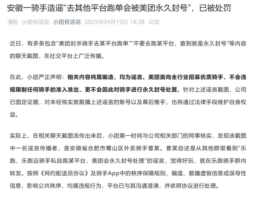 记者注意到,前不久,有多条涉及“美团封杀骑手去某平台跑单”“不要去跑某平台,查到就是永久封号”等内容的聊天截图在社交平台广泛传播。对此,美团官方公众号@小团有话说4月19日发文辟谣,称上述聊天截图中一名传谣者,系安徽合肥蜀山区的外卖骑手曹某。文章透露,曹某自述是从其他群里看到“乐跑、乐跑远骑手私自跑某平台,美团会永久封号处理”的谣言,觉得好玩,就在乐跑骑手群内转发。