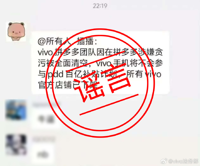 @vivo法务部 贴出标记为“谣言”的几张聊天记录及自媒体截图。截图中,有人声称:“vivo拼多多团队因在拼多多涉贪污被全面清空,vivo手机不会参与pdd百亿补贴计划,所有vivo官方店铺已下架”,“vivo的拼多多团队串通第三方商贩通过低价渠道获得vivo设备及配件,拼装后低价卖给拼多多百亿补贴赚取差价”。