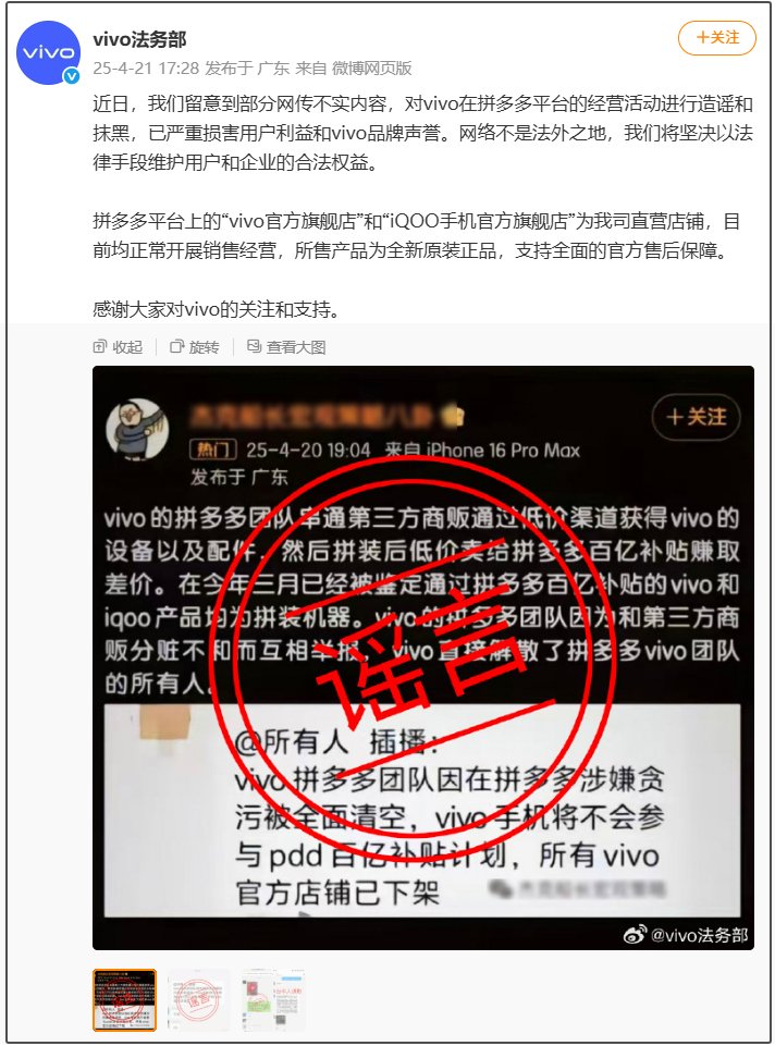 近日,我们留意到部分网传不实内容,对vivo在拼多多平台的经营活动进行造谣和抹黑,已严重损害用户利益和vivo品牌声誉。网络不是法外之地,我们将坚决以法律手段维护用户和企业的合法权益。