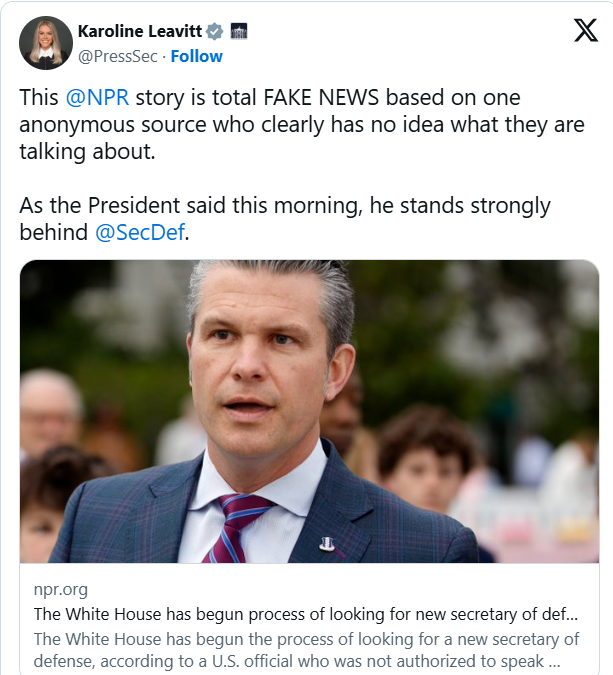 随后,新闻秘书卡罗琳・利维特(Karoline Leavitt)在火速在X平台上回应称,这篇报道是“基于一个匿名消息来源的假新闻”。