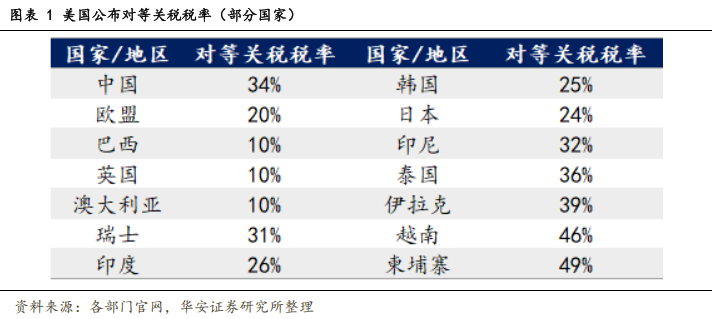国际关税形势波动,中美关税政策持续升级。自2025年2月,美国关税政策持续推进。2025年2月1日,美国总统特朗普签署行政令,在原有基础上对进口自中国的商品加征10%的关税,并取消T86清关政策(即800美元以下包裹免税)。3月3日,美国以“芬太尼问题”为由,将中国输美商品关税从10%上调至20%,部分商品综合税率超40%。4月2日,关税水平升级,美国总统特朗普签署“对等关税”行政令,宣布对所有国家征收10%的“基准关税”,对美国贸易逆差最大的国家征收个性化的更高“对等关税”。其中,对中国加征34%关税,对欧盟加征20%关税,对越南、柬埔寨分别征收46%、49%关税。