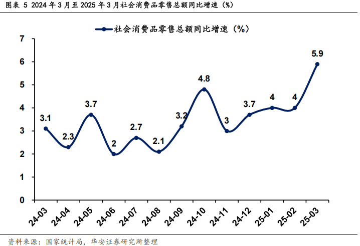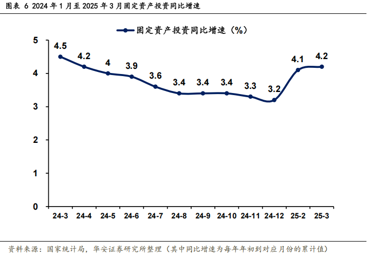 国家积极出台“扩内需”政策,促进消费投资形势积极向好回暖。根据国家统计局数据,1-3月份,社会消费品零售总额为124671亿元,同比增长4.6%,其中除汽车以外的社会消费品零售额为113434亿元,同比增长5.1%。3月份,社会消费品零售总额为40940亿元,同比增长5.9%,其中除汽车以外的社会消费品零售额为36610亿元,同比增长6.0%。固定资产投资逐渐增长,形势向好。2025年1-3月,全国固定资产投资(不含农户)为103174亿元,同比增长4.2%,增速高于1-2月0.1个百分点。其中,民间固定资产投资同比增长0.4%,增速高于1-2月0.4个百分点。3月份,固定资产投资(不含农户)环比增长0.15%。