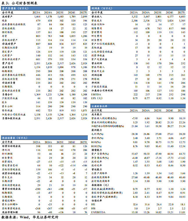 作为母婴商品连锁零售行业的龙头,2024年公司主业实现稳健增长。分产品来看,公司奶粉/食品/用品/棉纺/玩具及出行/母婴服务/供应商服务分别实现营收20.97亿元/3.12亿元/5.04亿元/2.23亿元/0.70亿元/0.36亿元/2.23亿元,同比+9.45%/+0.38%/-2.78%/-6.92%/-11.27%/-1.41%/-2.92%。分渠道来看,公司门店销售/电子商务/母婴服务/供应商服务分别实现营收24.84亿元/7.20亿元/0.36亿元/2.23亿元,同比+2.03%/+16.62%/-1.41%/-2.92%,电商渠道增速居前。分区域来看,华东/华南/华中/电商及跨境分别实现营收17.18亿元/3.65亿元/6.19亿元/7.63亿元,同比+0.09%/+11.74%/-0.56%/+14.88%,电商及跨境、华南地区增速居前。2024年公司毛利率/净利率分别为26.86%/3.40%,同比-1.52pct/-0.08pct,毛利率下降主因公司毛利率较低的奶粉业务占比提升,公司销售费用率/管理费用率/财务费用率分别为19.55%/3.14%/0.82%,同比-1.26pct/-0.21pct/-0.19pct,期间费用率呈下降态势。