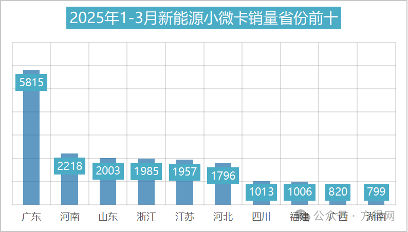 从新能源小微卡销售地区来看,2025年1-3月,广东、河南、山东为TOP3省份。其中广东省的销量一骑绝尘,成为全国新能源小微卡销量最高的省份,份额占据了近三分之一。一季度,山东超越浙江成为全国销量top3城市。