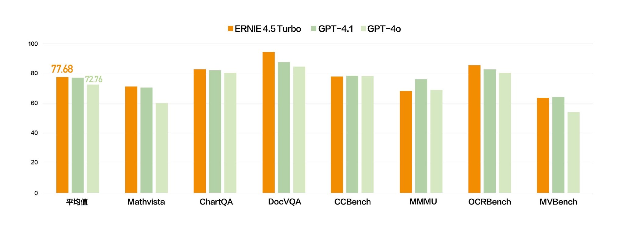“多模态将成为未来基础模型的标配,纯文本模型的市场会越变越小,多模态模型的市场会越来越大”。基于这样的判断,文心大模型4.5 Turbo和X1 Turbo都进一步增强了多模态能力。在多个基准测试集中,文心4.5 Turbo多模态能力与GPT 4.1持平、优于GPT 4o。