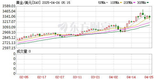 4月25日,国际金价继续下跌,盘中跌幅一度超2%,随后跌幅收窄,收盘下跌0.87%。
