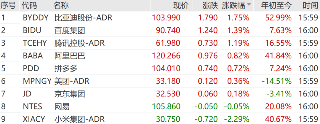 比亚迪股份涨1.75%,百度集团涨1.39%,腾讯控股涨1.19%,领涨万得中概科技龙头指数成份股。