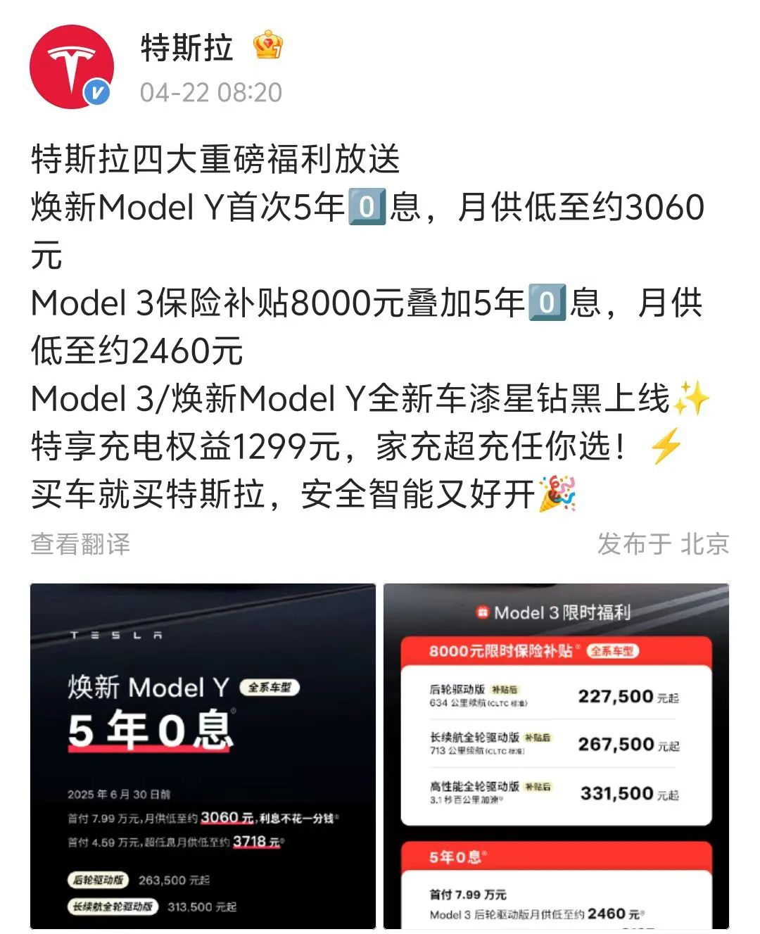 特斯拉中国促销加码。4月22日,特斯拉中国宣布,6月30日前,焕新Model Y首次全系推出5年0息,首付7.99万元,月供低至约3060元。