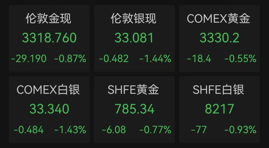 国际金价继续下跌,现货黄金跌0.87%,COMEX白银期货跌1.43%。