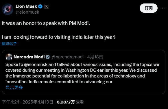 上周末,特斯拉CEO埃隆·马斯克在社交平台X上发文称,他非常荣幸能与莫迪总理交谈,并预告将在今年晚些时候访问印度。由于当下正值印度与美国洽谈贸易协议,内容可能涉及下调汽车关税。