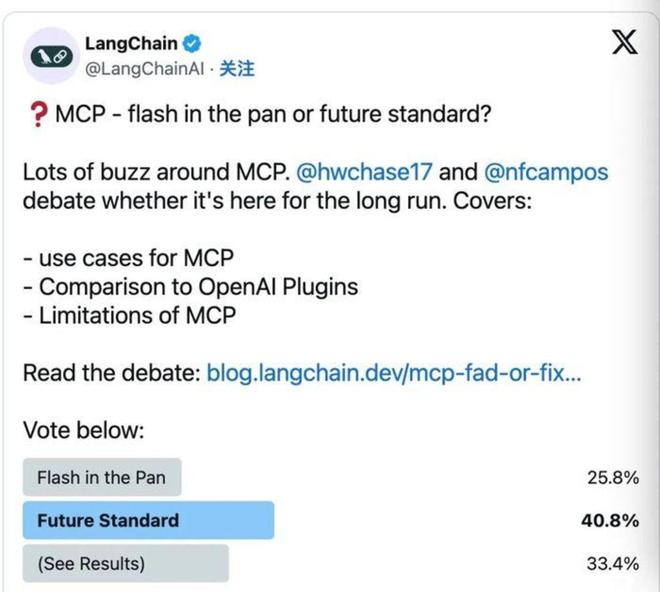 值得注意的是,这场辩论的同时,LangChain 还在网上发起了投票。投票结果,出人意料:40% 参与者支持 MCP 成为未来标准。