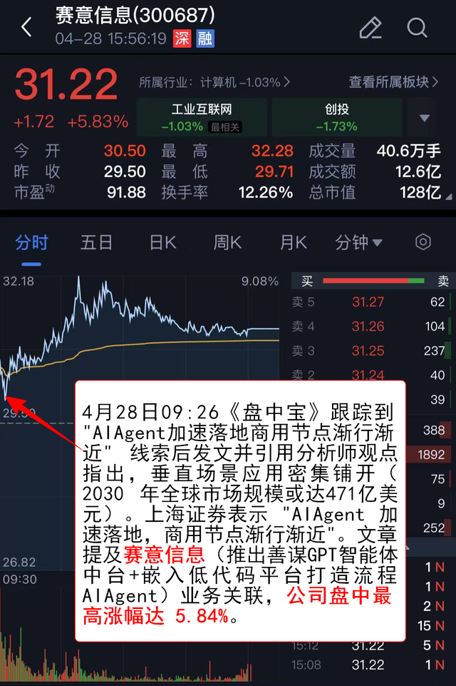 4月28日09:26《盘中宝》 跟踪到 "AIAgent 加速落地商用节点渐行渐近" 线索后发文并引用分析师观点指出,垂直场景应用密集铺开(2030 年全球市场规模或达471亿美元)。上海证券表示 "AIAgent 加速落地,商用节点渐行渐近"。文章提及赛意信息(推出善谋 GPT 智能体中台+嵌入低代码平台打造流程AIAgent)业务关联,公司盘中最高涨幅达 5.84%。