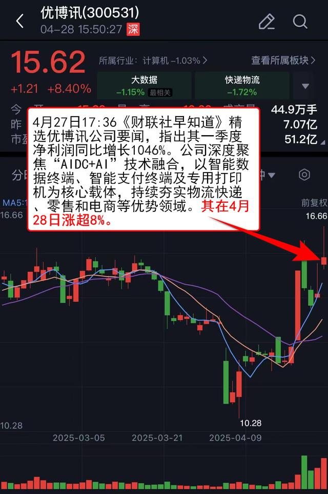 4月27日17:36《财联社早知道》 精选优博讯公司要闻,指出其一季度净利润同比增长1046%。公司深度聚焦“AIDC+AI”技术融合,以智能数据终端、智能支付终端及专用打印机为核心载体,持续夯实物流快递、零售和电商等优势领域。其在4月28日涨超8%。