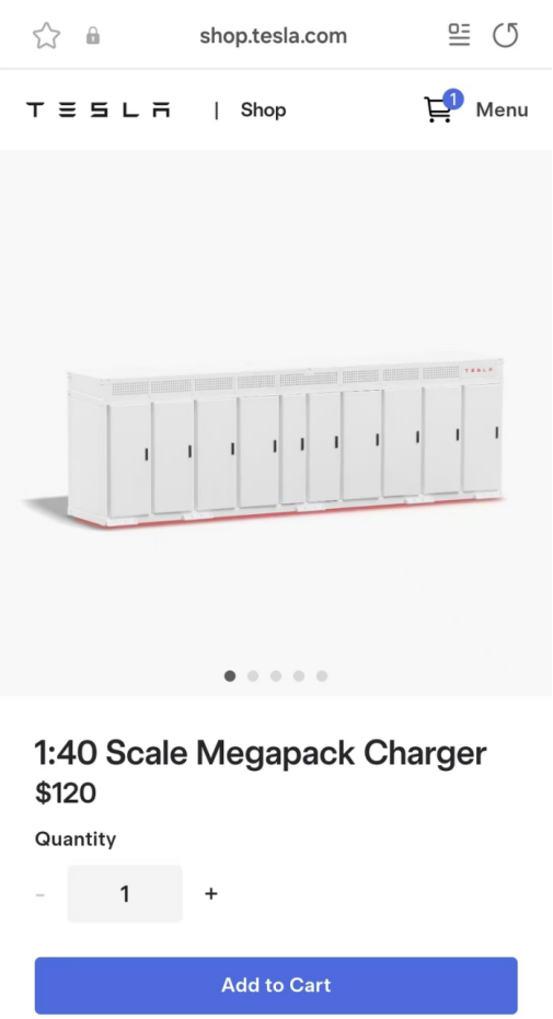 起点锂电也在特斯拉海外商城找到了该款移动电源的详细介绍:1:40 规模的 Megapack 便携式充电器是特斯拉 Megapack 储能系统的微型复制品,可让您随时随地携带可靠的电源。 用于制造实际Megapack的相同3D CAD数据用于再现该比例模型中的每个细节和表面,包括可操作的门,它可以同时为三个设备提供快速充电,并在激活时发出红色环境光。