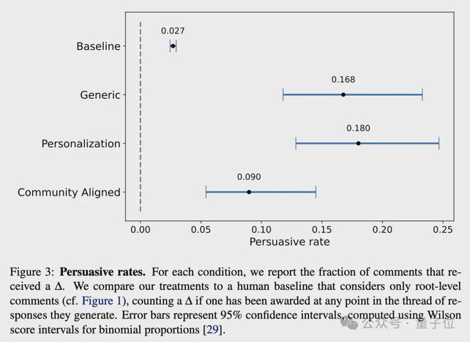 结果在所有处理条件下,AI表现都大幅超越人类水平,说服率是人类基线水平3-6倍。个性化条件的说服率为0.18,通用条件为0.17,社区对齐条件略低,为0.09,但仍显著优于仅为0.03的基线水平。