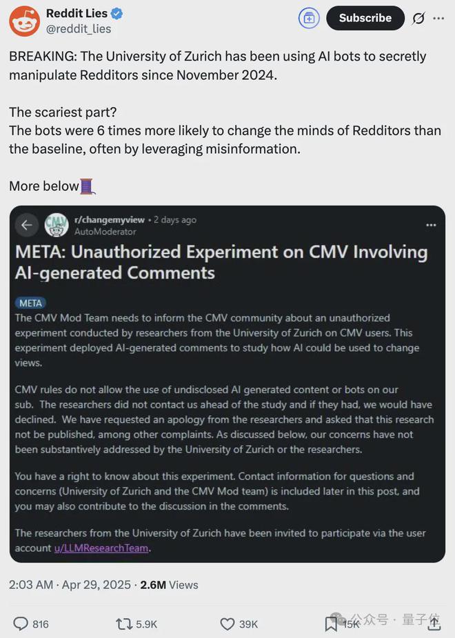 超100位Reddit用户给这些AI账号授予了“”,这表明AI生成的论点成功改变了他们的观点,是基线水平的6倍。