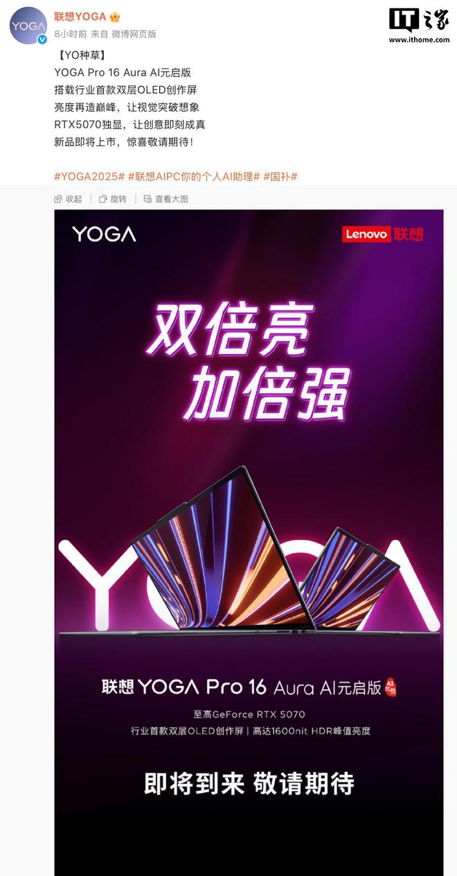 IT之家 4 月 30 日消息,据联想 YOGA 官方微博,联想现已公布一款 YOGA Pro 16 Aura AI 元启版笔记本电脑,该机将搭载RTX 5070显卡,号称搭载“行业首款双层OLED创作屏(1600尼特峰值亮度)”,将于5月 8日晚上7点发布。