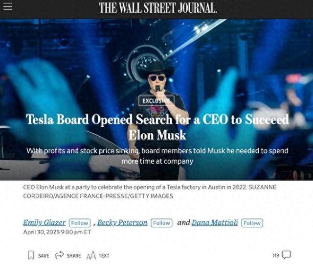 华尔街日报提到,约一个月前,特斯拉董事会已开始考虑寻找马斯克的接班人,原因是特斯拉股价下跌和部分投资者不满。目前,董事会成员已联系多家高管猎头公司,正式启动寻找特斯拉下一任首席执行官的程序。